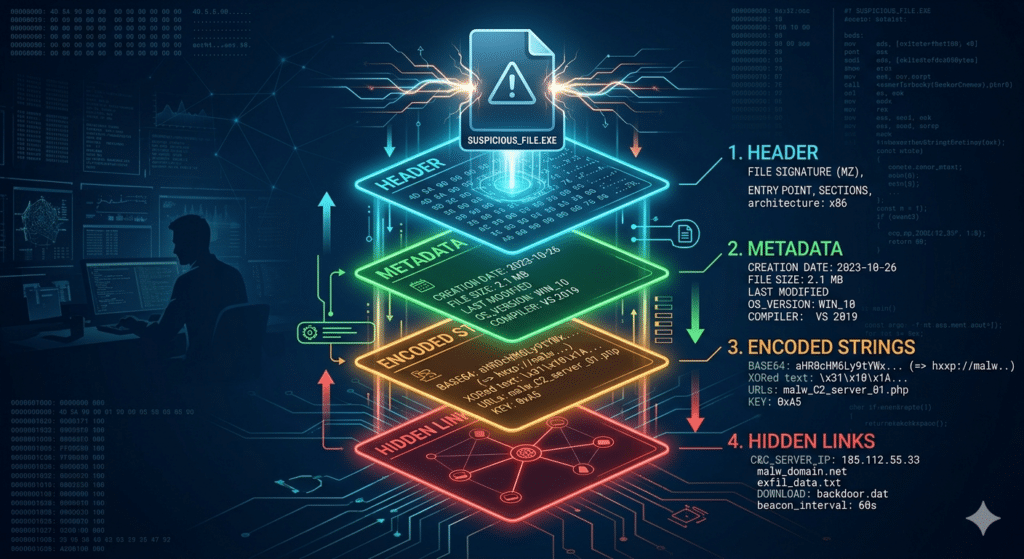 Scanner de Links e URLs Ocultas: Automatizamos a extração de caminhos de rede e endereços web codificados dentro de binários ou PDFs. Isso previne o acesso acidental a domínios de phishing ou servidores de comando e controle (C2) camuflados.